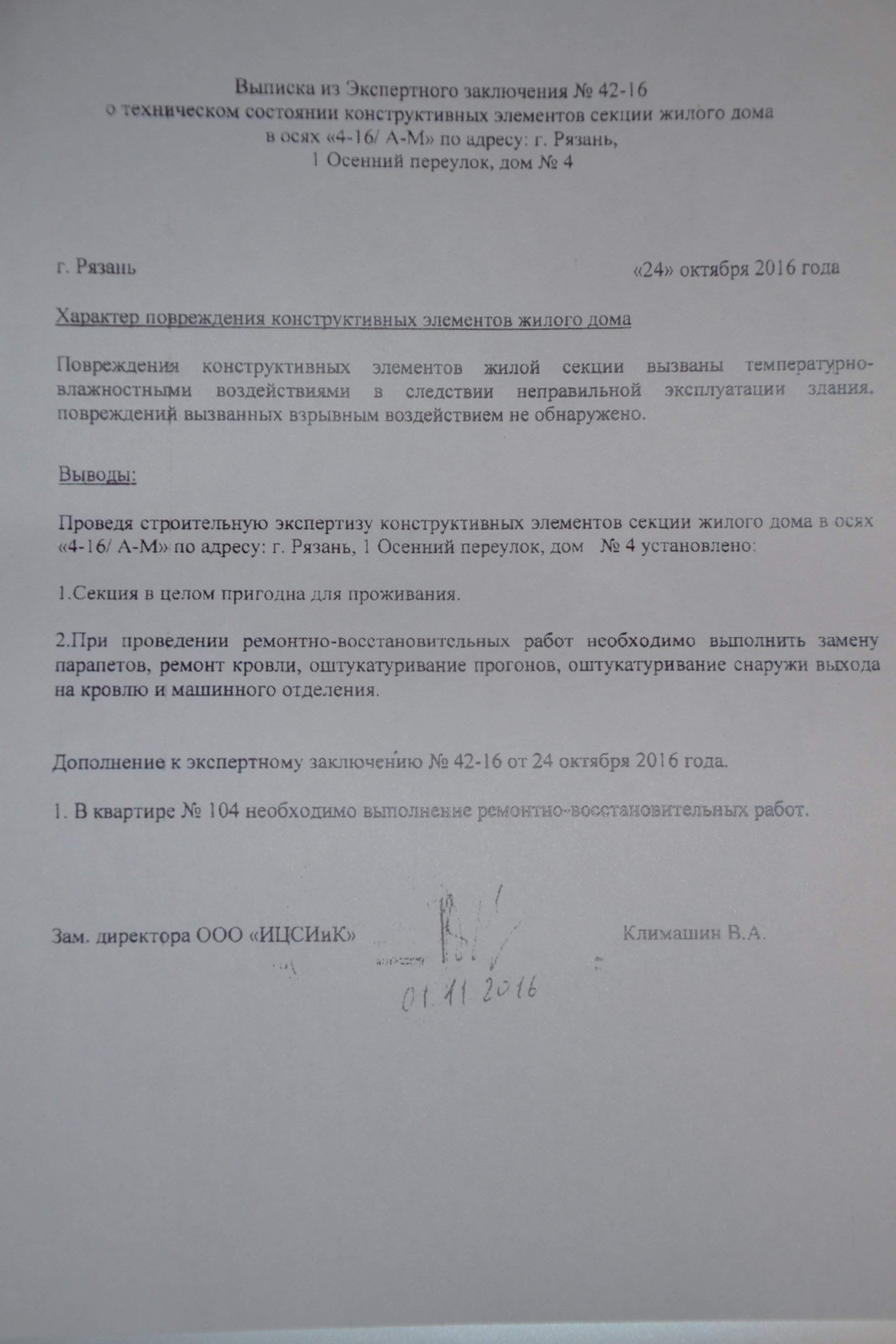 Повреждения конструктивных элементов жилой секции вызваны температурно-влажностными воздействиями в следствии неправильной эксплуатации здания, повреждений вызванных взрывным воздействием не обнаружено...