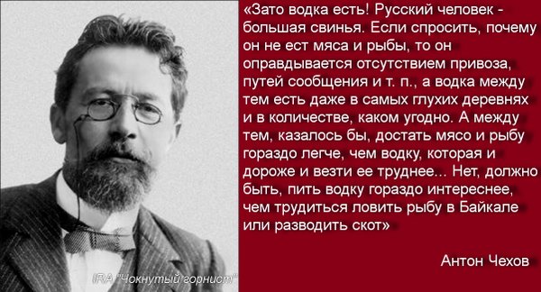 "Зато водка есть! Русский человек - большая свинья. Если спросить, почему он не ест мяса и рыбы, то он оправдывается отсутствием привоза, путей сообщения и т. п., а водка между тем есть даже в самых глухих деревнях и в количестве, каком угодно. А между тем, казалось бы, достать мясо и рыбу гораздо легче, чем водку, которая и дороже и везти ее труднее... Нет, должно быть, пить водку гораздо интереснее, чем трудиться ловить рыбу в Байкале или разводить скот".