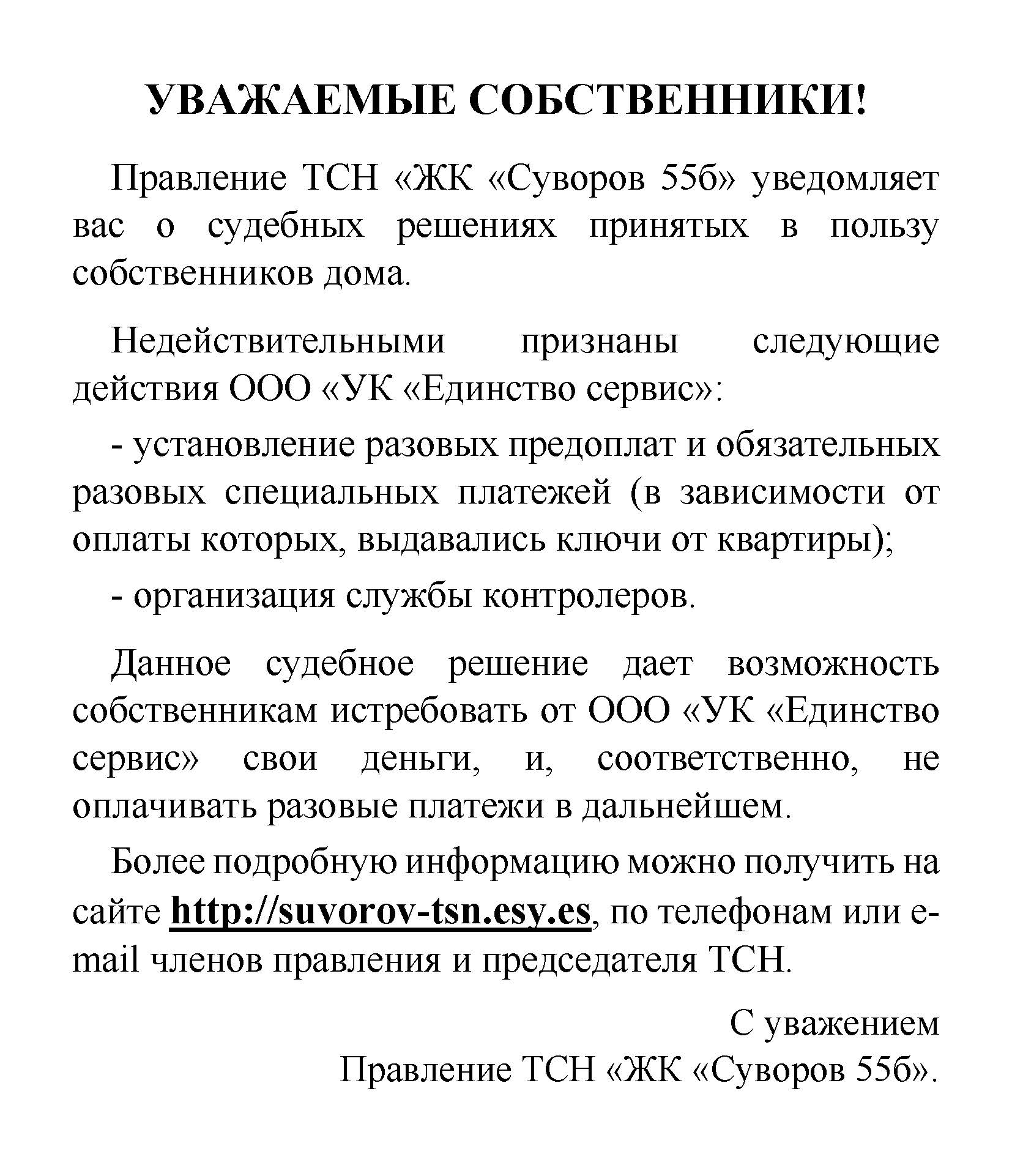 В настоящее время ТСН уже отсудило некоторые незаконные "решения" пролоббированные УКЕС. Правление ТСН на этом не остановилось и намерено добиться таких же результатов по всем незаконным решениям с тем, чтобы вернуть все денежные средства, незаконно взятые УКЕСом. Посему, все кто хочет вернуть свои деньги, не подписывайте ни какие документы, бланки, решения и др. УКЕСу. Это будет самой лучшей поддержкой с вашей стороны. Только с вашей поддержкой Правление ТСН быстро и окончательно вернет вам ваши ден.средства.
