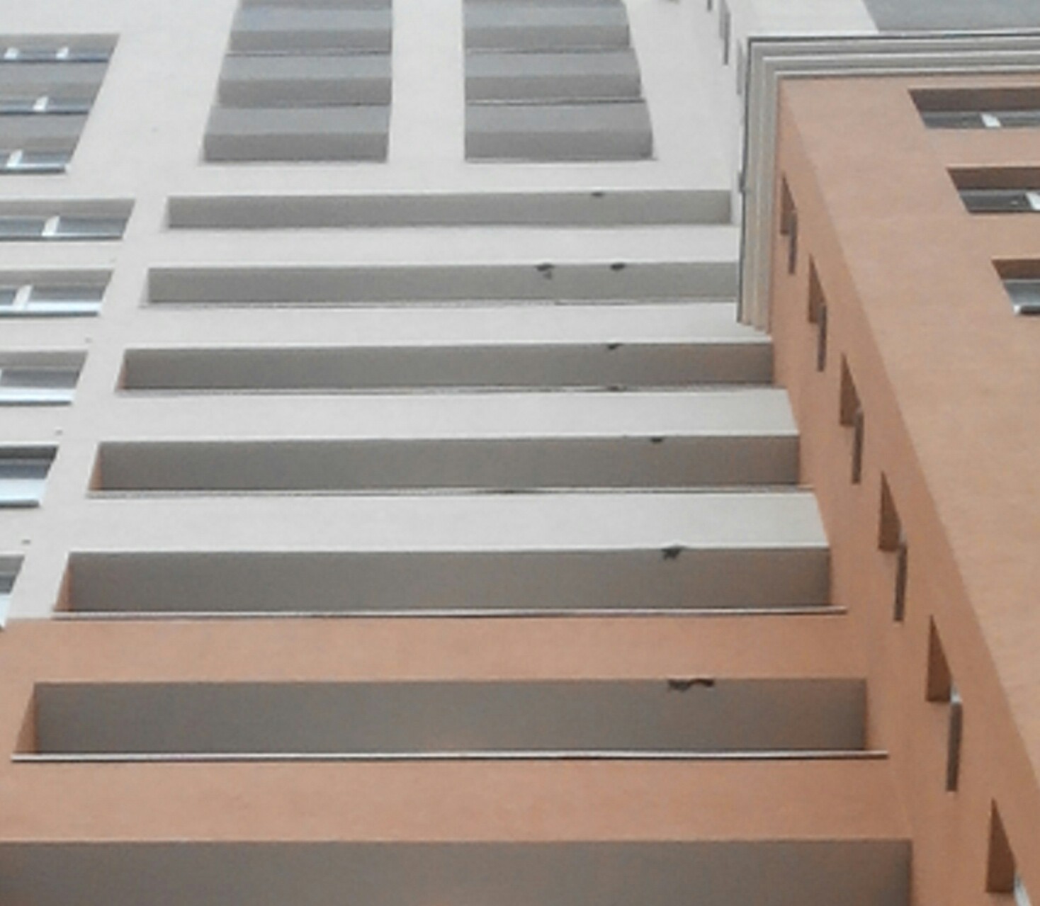 Эти повреждения фасада появились, когда строители лебёдкой поднимали мешки с штукатурной смесью на верхние этажи. Платформа с мешками раскачивалась и билась о стены. При ближайшем осмотре видно, что фасад повреждён до базальтовой плиты, потом строители это замазали раствором, но сделали плохо, на 12 этаже видно как сильно повреждён декоративный козырек и часть отлива.