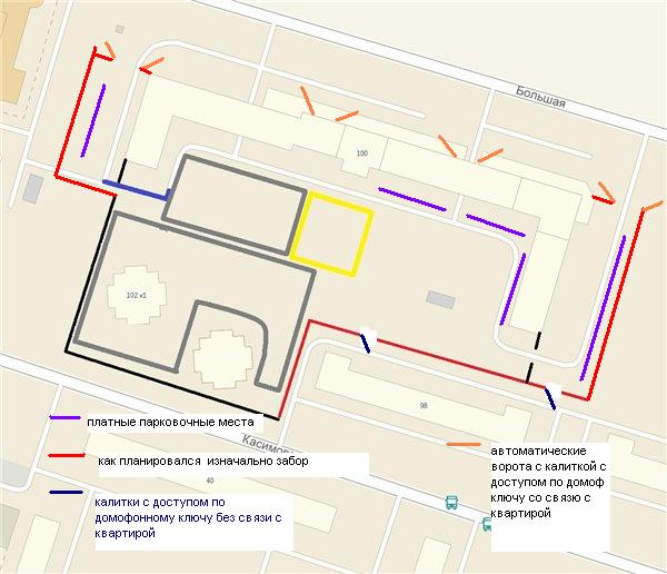 Foxxerr писал(а):Что касается забора - обеими руками за. Довольно давно думаю, как его лучше пустить. Все равно получается, что внешняя парковка будет открытой, а забор будет заканчиваться на краях дома №100.