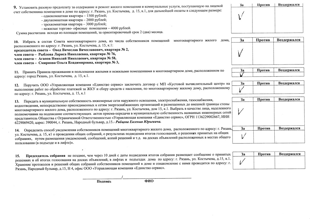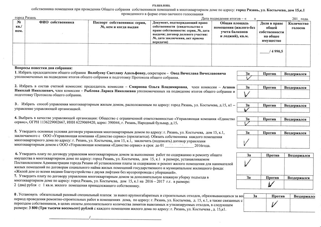 До подписания договора с УК, необходимо, чтобы было принято решение собрания собственников, т.к. договор с УК ссылается на это решение. Необходимо заполнить решение собственника жилого помещения, а менно проставить галочки с чем согласен, а с чем нет. Я вот так заполню...