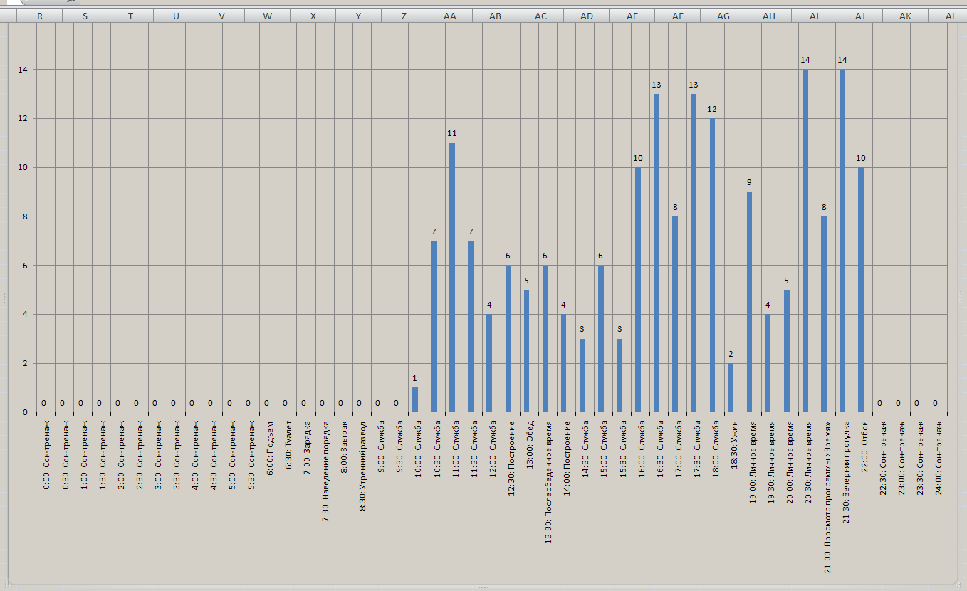 Ради интереса я забил в Excelовскую таблицу времена отправки Дентарасовым всех своих постов (начиная с апреля с.г.), подсчитал их количество в группах по полчаса и наложил на распорядок дня бойца СА (как я этот распорядок помню). Получилась вот такая картинка: