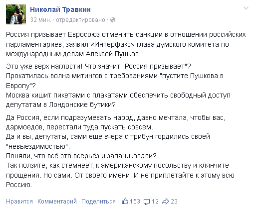 Куда же у депутатов исчезли гордость и радость в связи с попаданием в санкционные списки? Посмотрите, что делается: после того, как вчера Нарышкину закрыли въезд в Финляндию, сегодня Дума уже требует отменить все визовые ограничения для депутатов (отметим – только для депутатов, своя рубаха ближе к телу). А как же Игорь Иванович?