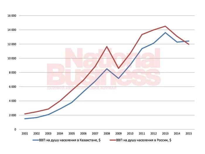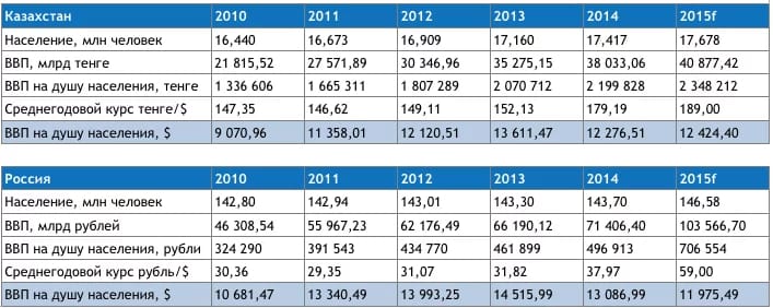 По результатам I полугодия казахстанская экономика обогнала российскую по ВВП на душу населения. Согласно прогнозу, по результатам 2015 года ВВП на душу в России составит 11.975 USD, в Казахстане — 12.424 USD.