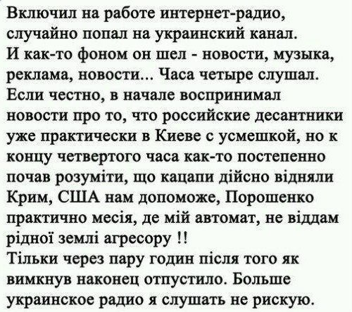 Из бывших писал(а):Все ваши кривды выковыриваемые из укросайтов, все а ля философические страдания, все ваши непомерные желания отличиться в количестве и качестве дерьма, вами зачерпнутого из "святых" для вас источников и выплюнутых потом на людей и страну, уже не позволяет сомневаться в злобном и вражеском отношении ко всему русскому.