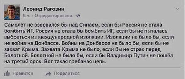 Вот про такие "факты" я и говорил в другой ветке. Представьте себе, я начал расскзывать о том, что ко мне приходил участковый и т. п. Кто то(кому выгодно) мне поверит, кто то - нет.Avrely писал(а):«Пришли… участковый, помощник его… и из СБУ сотрудник… молодой парень, вобщето-то… небритый (бытовая маскировка), ну… лет ему… как моему сыну… Короче, мы все под «колпаком» СБУ… мы все сепары… пока еще… бытовые… хотя завтра… Претензия — я на своей странице на ФБ сделал перепост публикации В.В. Корнилова, донецкого политолога, историка, писателя и признанного во всём Цивилизированном Мире эксперта по глобальным проблемам и конфликтам «местного значения»… Ксерокопии скринов мне были предъявлены… с отметкой маркером желтым цветом некоторых фраз В. Корнилова», — написал Румянцев в фейсбуке.