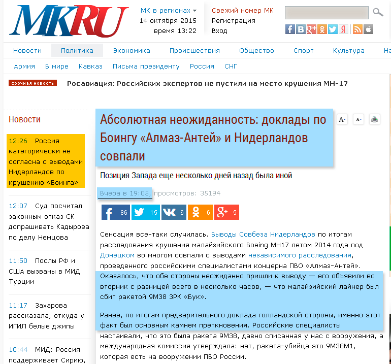 Вчера на Вести.24 целых 10 бегущих строк об отчете Алмаза и лишь затем пара строк об отчете СБН, в создании которого принимали специалисты более высокого уровня (по 30 лет расследующие авиакатастрофы), в том числе и из РФ.