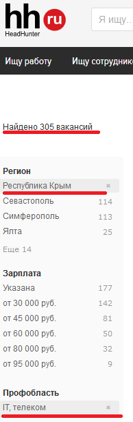 http://www.superjob.ru/vacancy/search/?period=0&t[]=217&catalogues=33&pay1=&pay0=0&experience=0&type_of_work=6&place_of_work=0&age=&pol=0&education=0&lng=0&lnlev=0&lang0=0&agency=0&moveable=0&active=0&detail_search=1&sbmit=1&extended=1Соотношение на данный момент (23:40 23-July-2015) 36 против 115, т.е. вакансий в Рязани вчетверо больше, чем в Крыму. Очень, конечно, весьма и весьма приблизительна, но тем не менее…