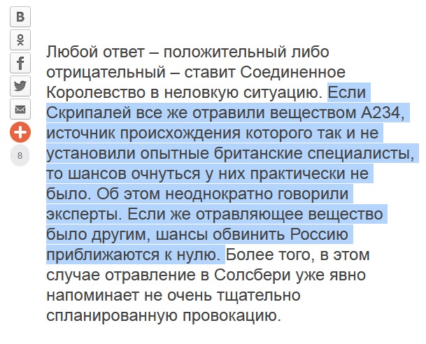 ivanes писал(а):Если Скрипалей все же отравили веществом А234, источник происхождения которого так и не установили опытные британские специалисты, то шансов очнуться у С крипалей практически не было. Об этом неоднократно говорили эксперты. Если же отравляющее вещество было другим, шансы обвинить Россию приближаются к нулю. Более того, в этом случае отравление в Солсбери уже явно напоминает не очень тщательно спланированную провокацию.