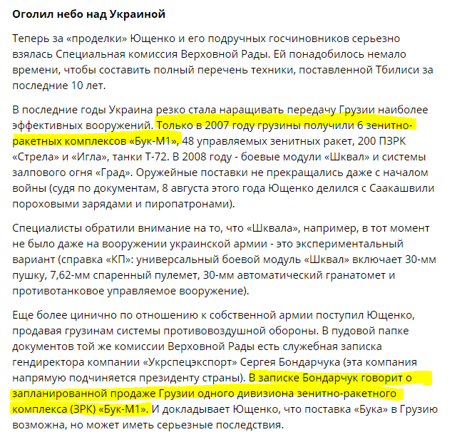 Ющенко... приказывает готовить передачу ЗРК «Бук-М1» Грузии. Более того, перед самым началом вторжения армии Саакашвили в Южную Осетию (август 2008 г.) Украина передала Грузии в общей сложности ПОЛОВИНУ из тех, что у нее были.