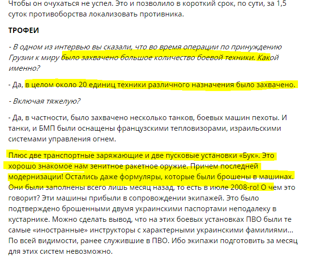 Плюс две транспортные заряжающие и две пусковые установки «Бук». Это хорошо знакомое нам зенитное ракетное оружие. Причем последней модернизации! Остались даже формуляры, которые были брошены в машинах. Они были заполнены всего лишь месяц назад, то есть в июле 2008-го! О чем это говорит? Эти машины прибыли в сопровождении экипажей. Это было подтверждено брошенными двумя украинскими паспортами неподалеку в кустарнике. Можно сделать вывод, что на этих боевых установках ПВО были те самые «иностранные» инструкторы с характерными украинскими фамилиями... По всей видимости, ранее служившие в ПВО. Ибо экипажи подготовить за месяц для этих систем невозможно…—