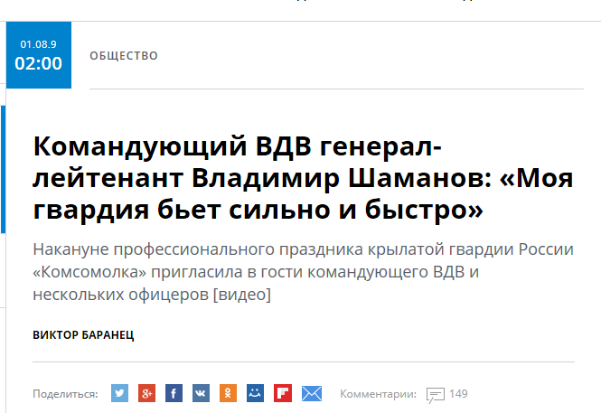 Источник: «Комсомольская Правда», № от 01 авг. 2009 г.Командующий ВДВ генерал-лейтенант Владимир Шаманов: «Моя гвардия бьет сильно и быстро»