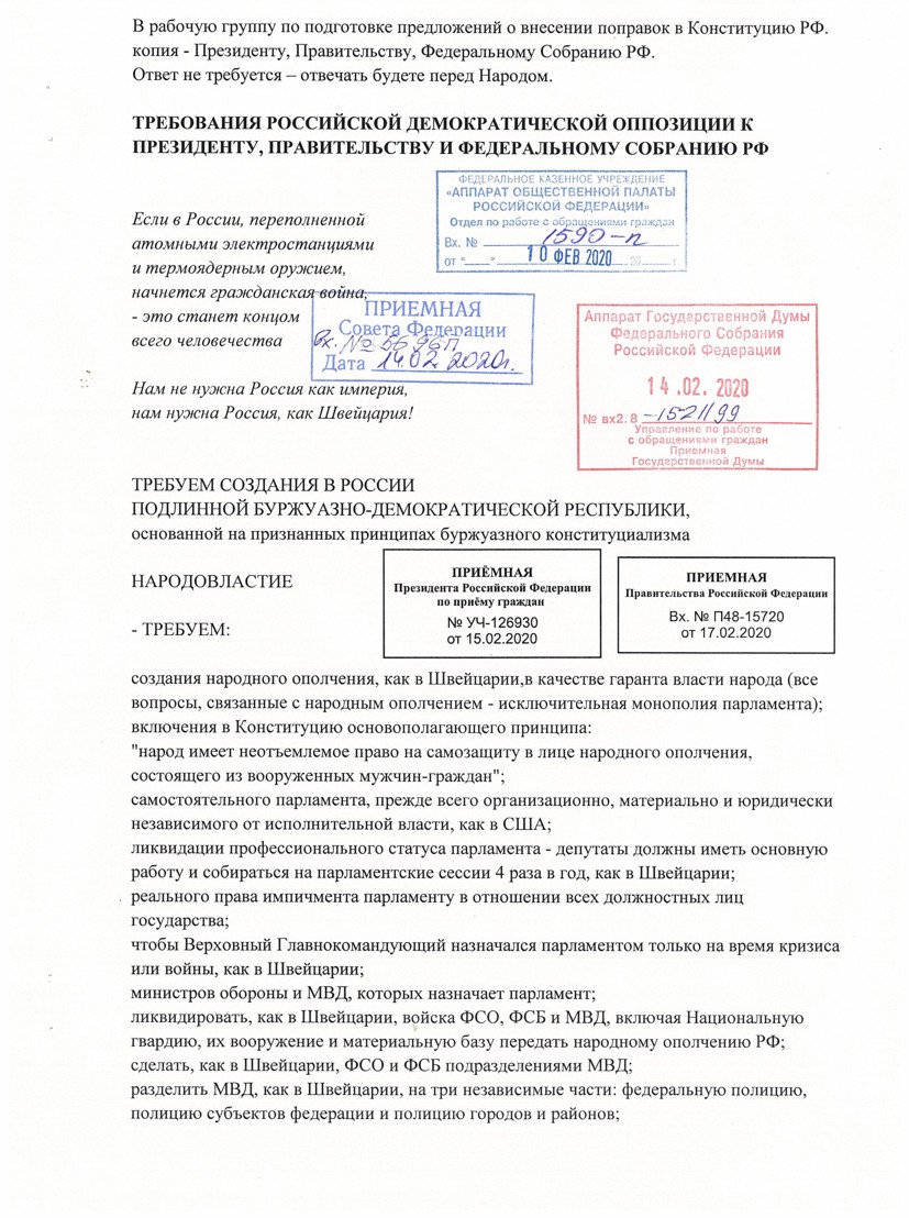 копия - Президенту, Правительству, Федеральному Собранию РФ.