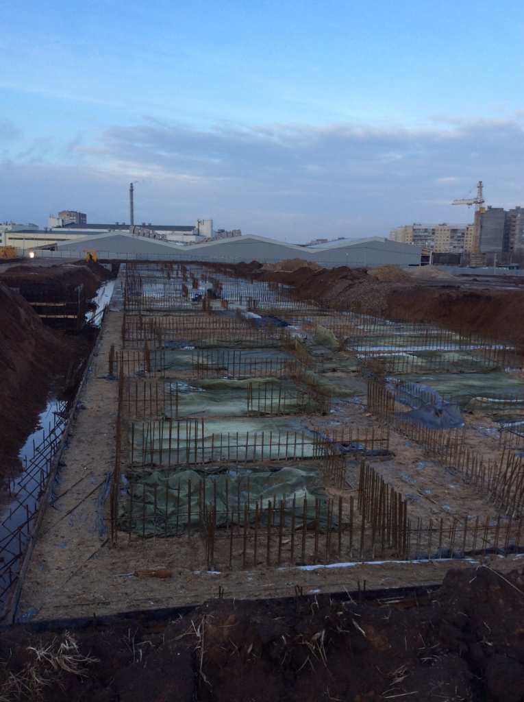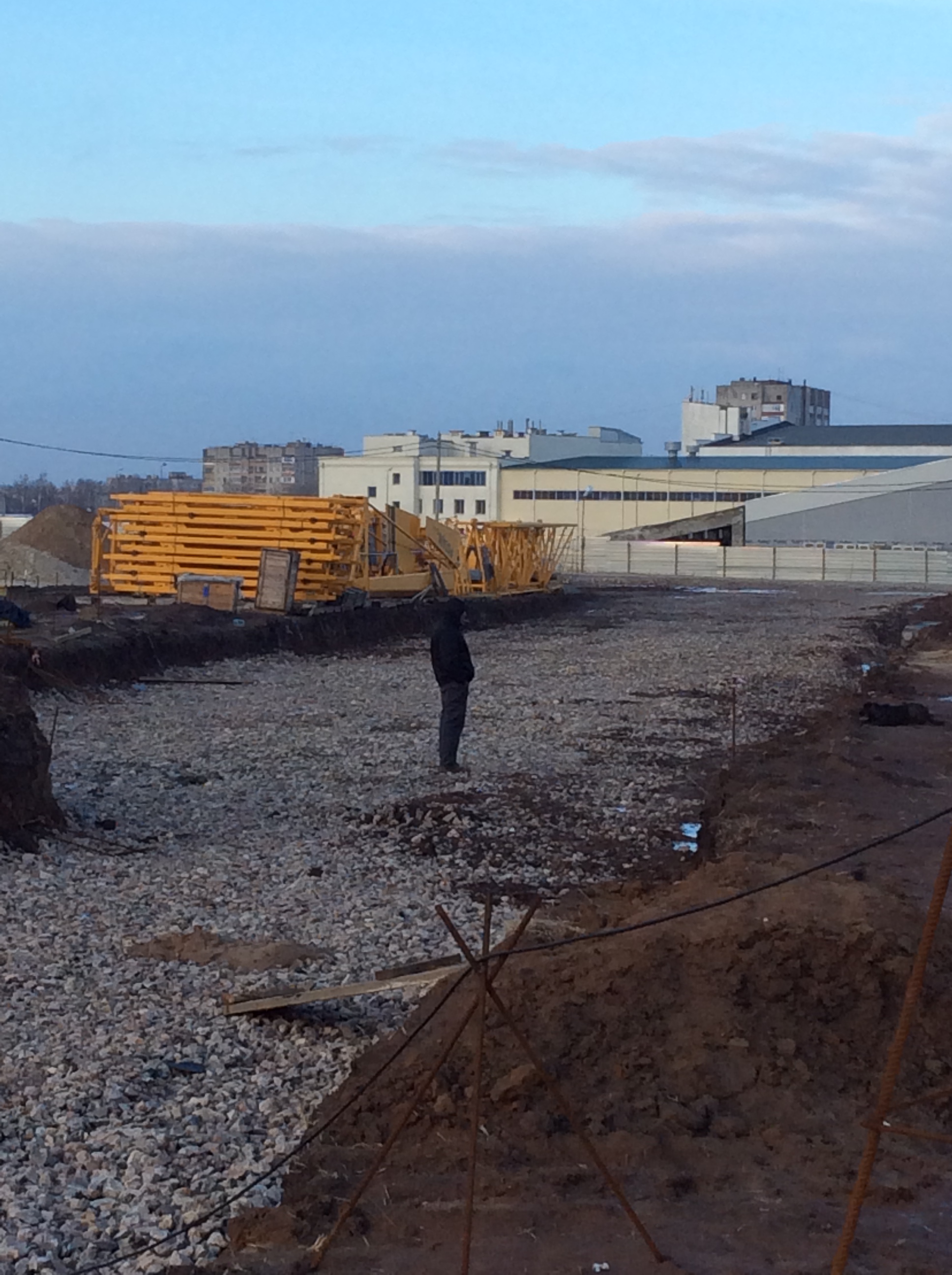 Залита ,полностью, плита.. Готовится,под заливку,основа для второго крана.После Ледового ,поворот направо,там можно посмотреть. После теннисного корта стройка. Забор сейчас сняли,идет планировка дороги. Правда ничего не видно т.к. фундамент ниже уровня земли.На следующей недели начнется вязка арматуры под стены