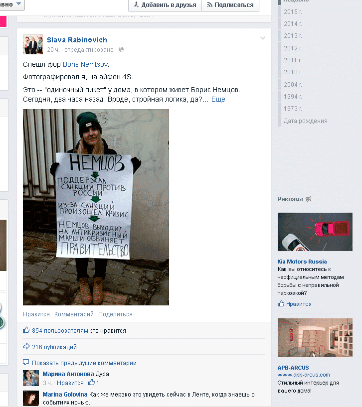 MrM писал(а):1. Что случилось ровно неделю назад в километре от места смерти Немцова? Собралась группа граждан, с благословления Кремля угрожавшая физической расправой оппозиции …