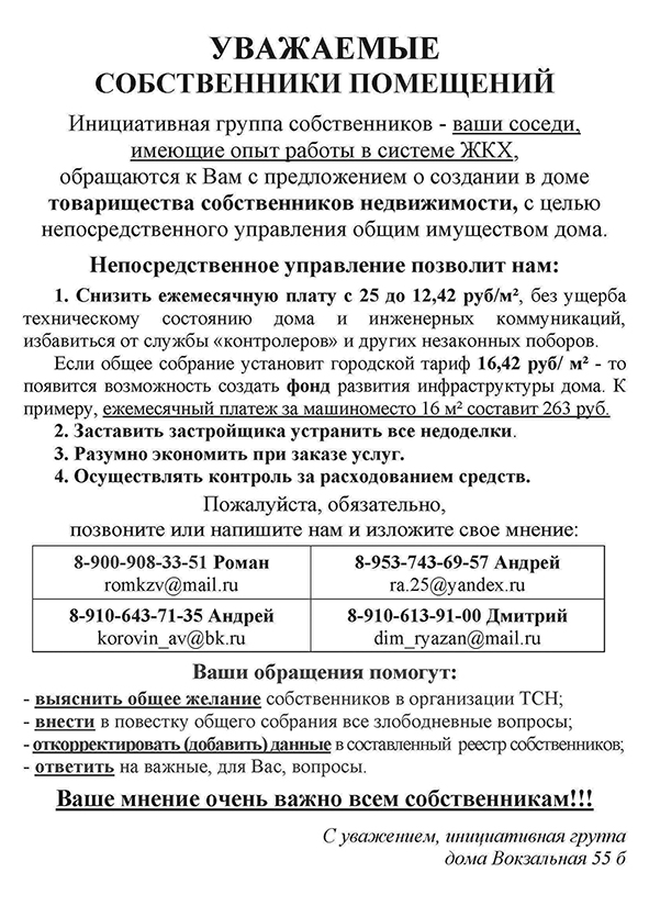 Уважаемые соседи. Инициативная группа собственников нашего дома предлагает самоорганизоваться в Товарищество собственников недвижимости. Пока мы не организованы нас никто слушать не будет. На каждое помещение, вчера, расклеено уведомление с предложением о создании в доме ТСН. В лифтах и на досках объявлений расклеены уведомление и проект сметы ТСН. Тариф для ТСН просчитан и составляет 12,24 руб./кв.м. вместо 25 руб. Тариф 12,24 руб./кв.м. покрывает все расходы по дому. Разница между тарифами 25 руб. и 12.24 руб. - 12.76 руб., за вычетом зарплаты контролеров, "оседает", где - всем наверно понятно. В уведомлении указаны телефоны и е-mail инициативной группы. Ознакомьтесь пож. со сметой. Ждем от вас звонков или писем с конструктивными предложениями. Обязательно звоните или пишите. ТСН - это дело общее.