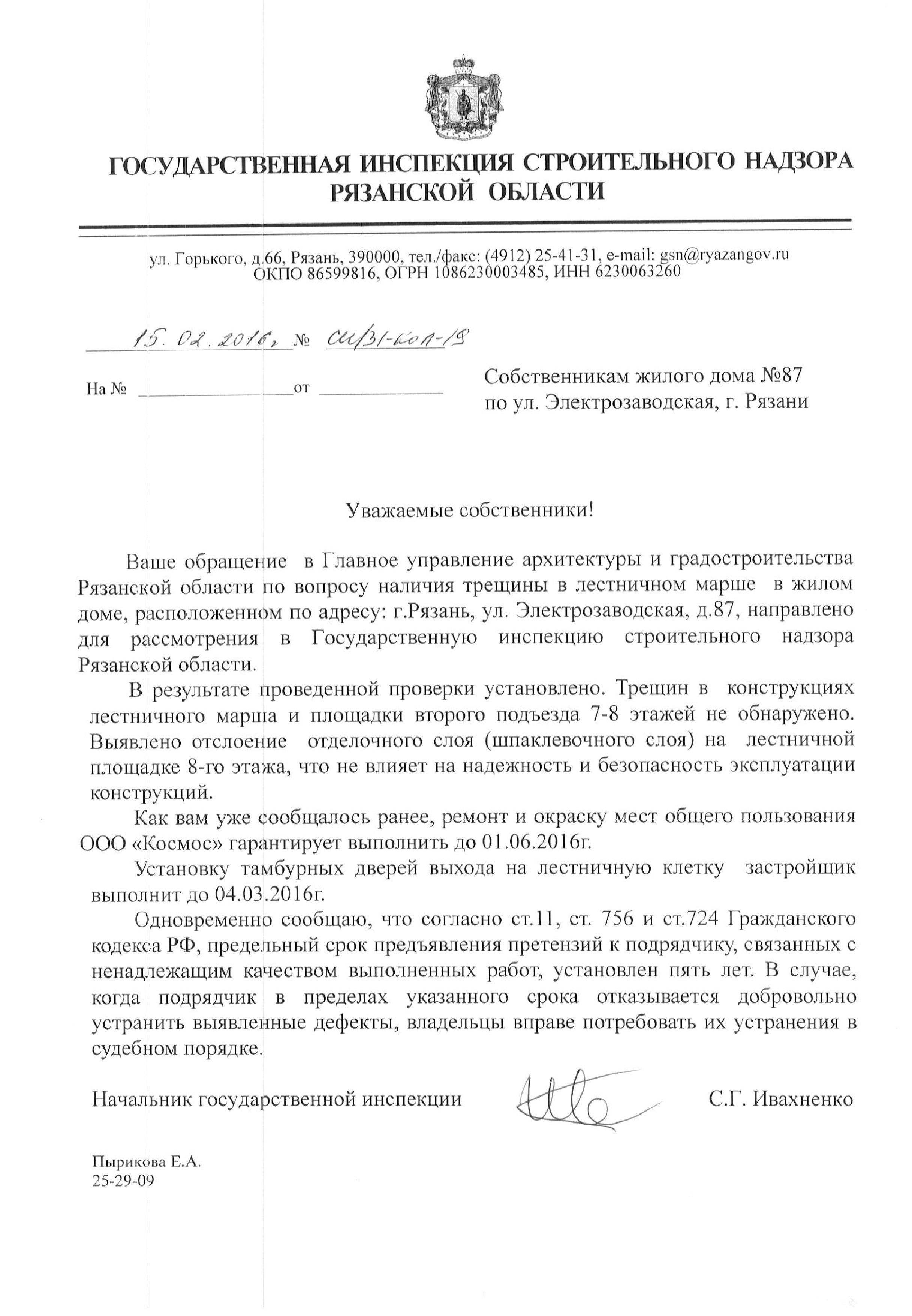 Вот и ответ подошёл от Государственной инспекции строительного надзора по Рязанской области. Правда один и тот же текст под разными исходящими номерами.