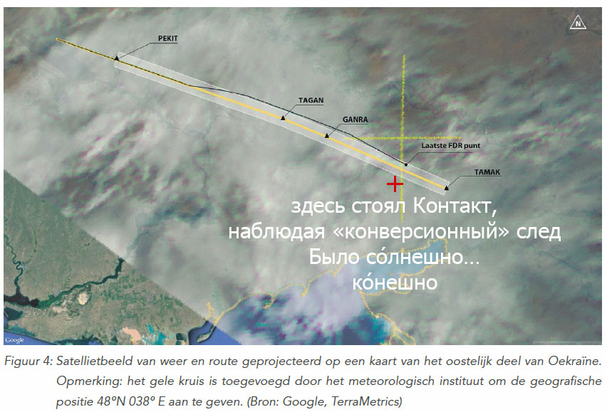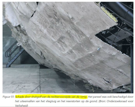 2. очень неравномерное распределение пробоин на левой скуле — в одном месте составляющее 250 дырок на квадратный метр («hoogste dichtheid was ongeveer 250 beschadigingen per vierkante meter») и локализованное: «Обломки ЛА со следами воздействия более чем 350 частиц, обладавших высокой энергией…Эти повреждения концентрированы в группу вокруг левой стороны и начинаются поблизости от окон кабины 2 и 3» («De wrakstukken van het vliegtuig bevatten meer dan 350 inslagen van hoogenergetische deelties… Deze beschadigingen waren geconcentreed in een band rondom de linkerkant van de romp en beginnen naast de cockpitruiten 2 en 3»);