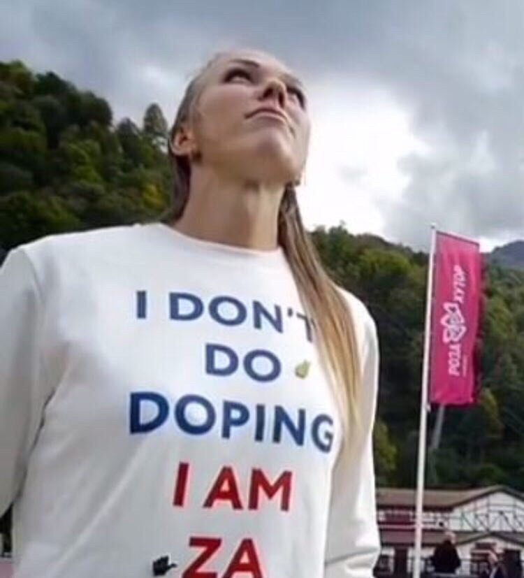 Это бобслеистка Надежда Сергеева. Позирует в Сочи в футболке с надписью "Я не употребляю допинг"